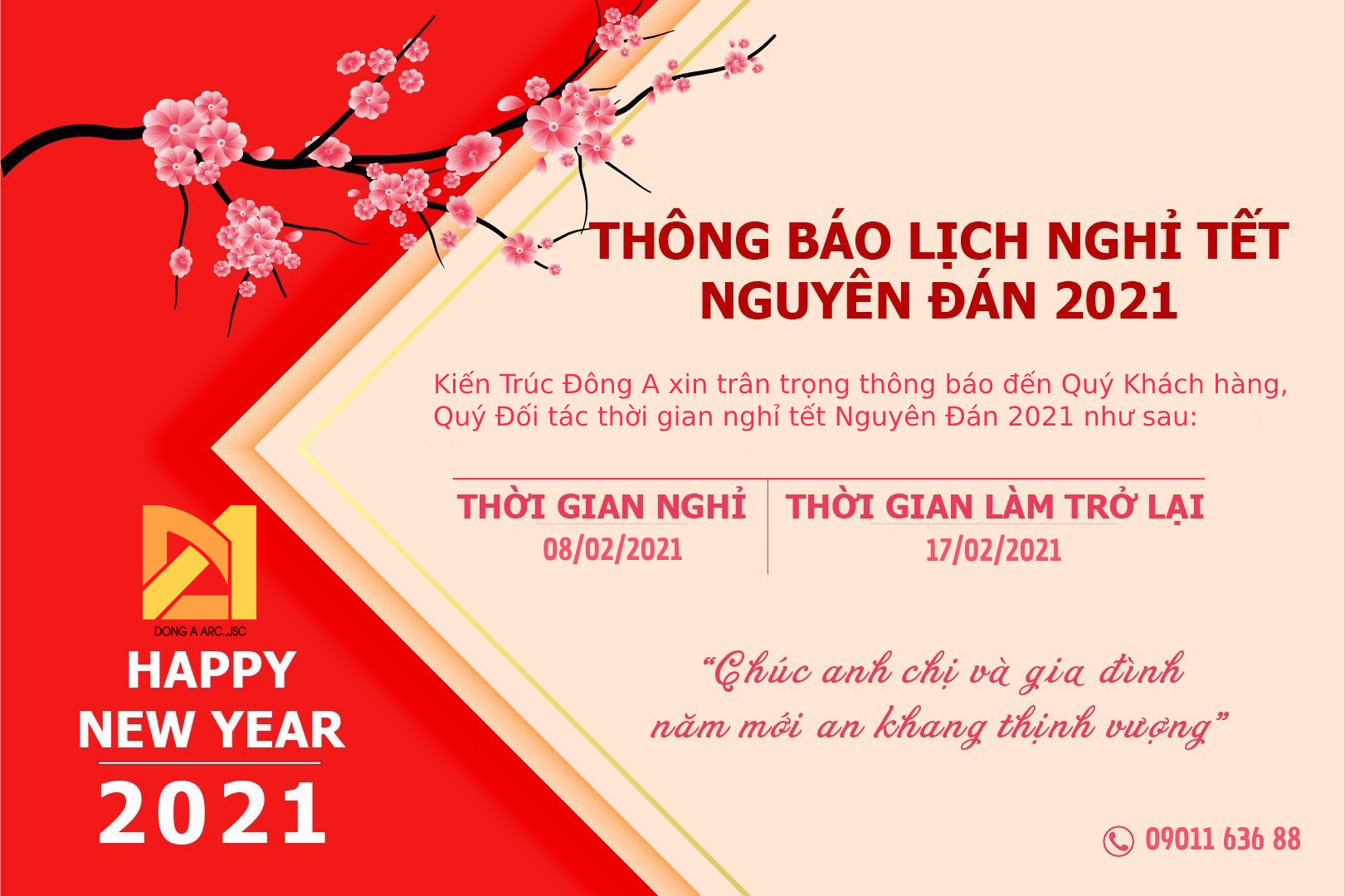 Chúng tôi xin trân trọng thông báo lịch nghỉ Tết Nguyên Đán 2021 và kính chúc tất cả nhân viên cùng quý khách hàng, quý đối tác một năm mới an khang, thịnh vượng, sức khỏe và thành công!
