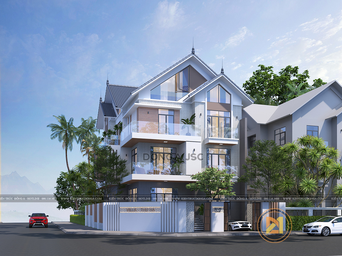 Với 2 mặt tiền rộng đẹp, kiến trúc sư có thể thỏa sức sáng tạo. Đặc biệt trong thiết kế này, các kiến trúc sư của Đông A tập trung nhấn mạnh vào các hình khối khỏe khoắn. Mẫu biệt thự 3 tầng được thiết kế theo lối hiện đại, tối giản các chi tiết cầu kỳ, tỉ mỉ. 2 mặt tiền với những khối hình vuông vức khỏe khoắn thể hiện được phần nào cá tính của chủ nhà. Kết hợp sử dụng vật liệu trang trí hiện đại phải kể tới vật liệu kính , gạch thẻ ốp tường với độ bền cao tạo nên vẻ đẹp hài hòa, cân đối cho ngôi nhà.