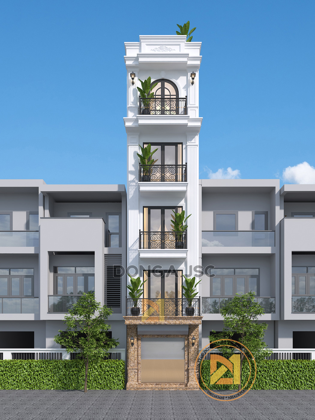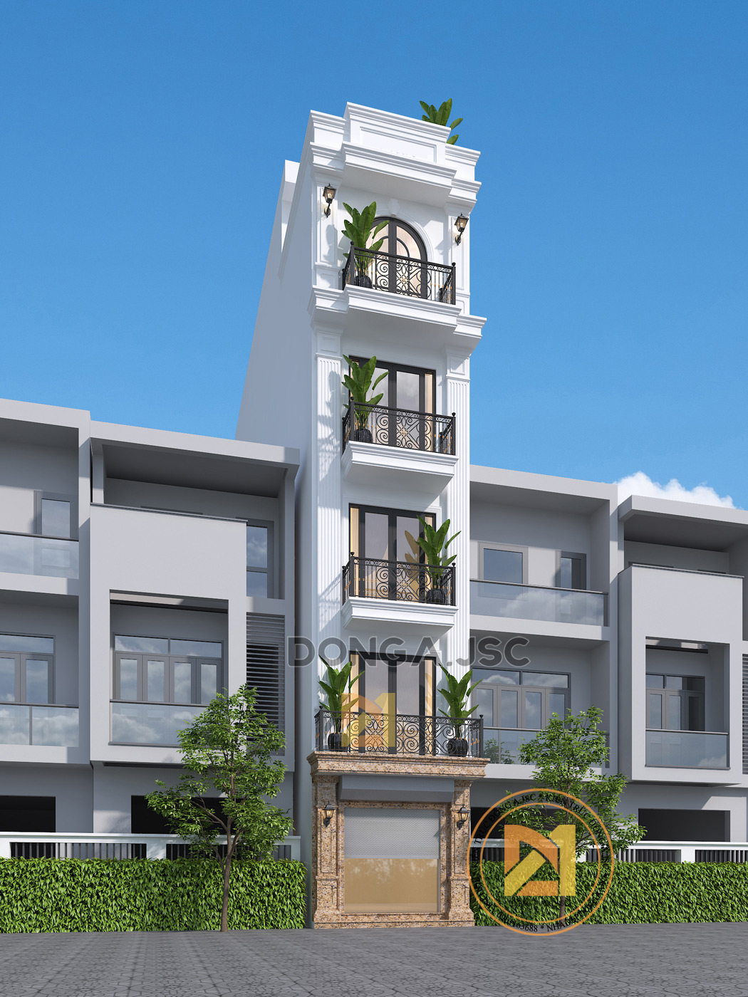 Mẫu nhà phố tân cổ điển 6 tầng được xây dựng kiên cố và bề thế trên một khu đất có mặt tiền hẹp. Toàn bộ 6 tầng của ngôi nhà được sử dụng gam màu trắng chủ đạo mang lại nét đẹp tinh tế toát lên sang trọng mà thanh lịch. Để tạo điểm nhấn, KTS Đông A sử dụng đá mable màu vàng ốp mặt tiền tầng 1 thêm kiêu sa và thu hút sự chú ý của khách hàng thuận lợi cho việc kinh doanh. Theo quan niệm xưa, màu vàng chính là gam màu của quyền lực, của sự may mắn, chính vì thế khi sử dụng cho việc kinh doanh sẽ mang lại sự thành công, phát triển thịnh vượng.