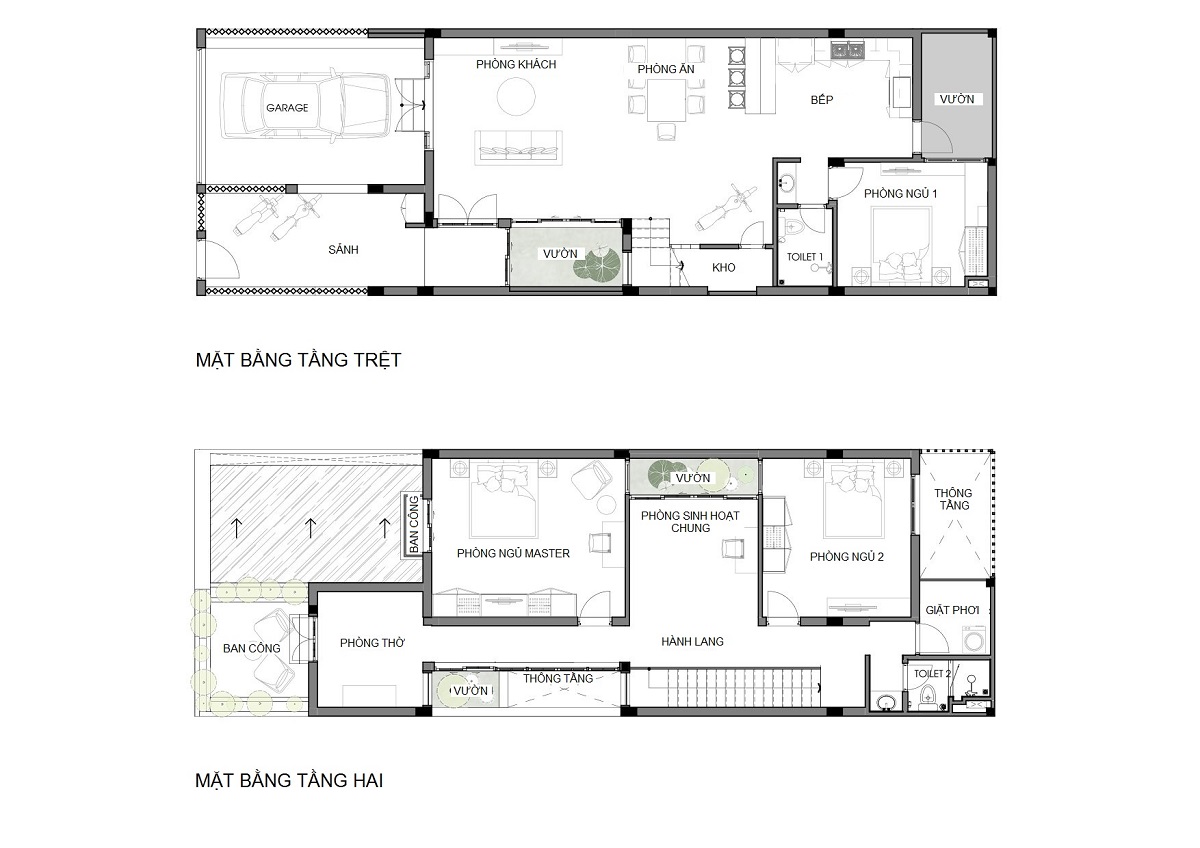 Nhà có bốn mảnh vườn nhỏ, vừa tăng mảng xanh cho công trình, vừa kết hợp thông tầng đưa ánh sáng đến mọi góc nhà.