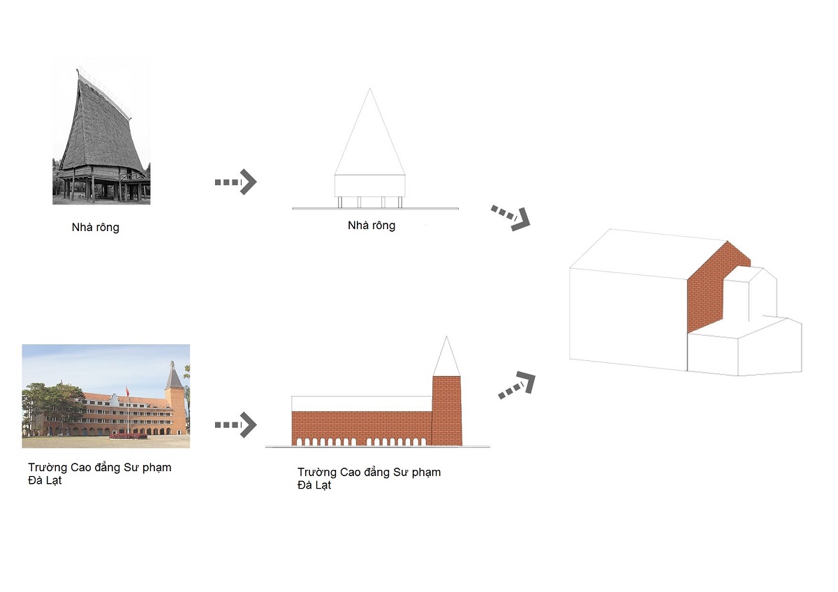 Từng có thời gian sống ở Đà Lạt thuở nhỏ, gia chủ còn mong căn nhà giữ được cái hồn của những công trình xưa cũ và mang nét văn hóa địa phương. Phương án của kiến trúc sư là thiết kế nhà hai tầng lấy cảm hứng từ nhà rông Tây Nguyên và trường Cao đẳng Sư phạm Đà Lạt do người Pháp xây dựng.