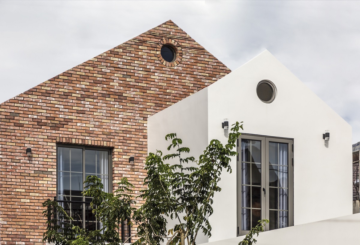 Nhìn từ phía ngoài, ngôi nhà đã thể hiện được những nét đặc trưng của hai công trình này qua mái nhọn và tường gạch.