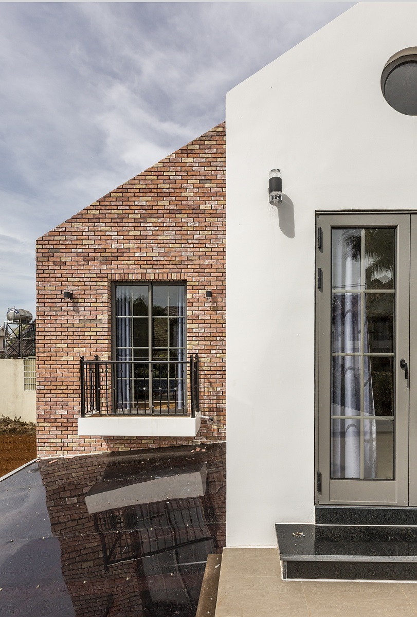 Nhờ hình khối vuông vắn và hiện đại hơn nguyên mẫu, công trình phù hợp với độ tuổi của gia chủ cũng như xu thế kiến trúc ngày nay. Màu trắng và màu gạch đỏ của mặt tiền giúp công trình nổi bật mà vẫn hòa hợp với bối cảnh xung quanh.