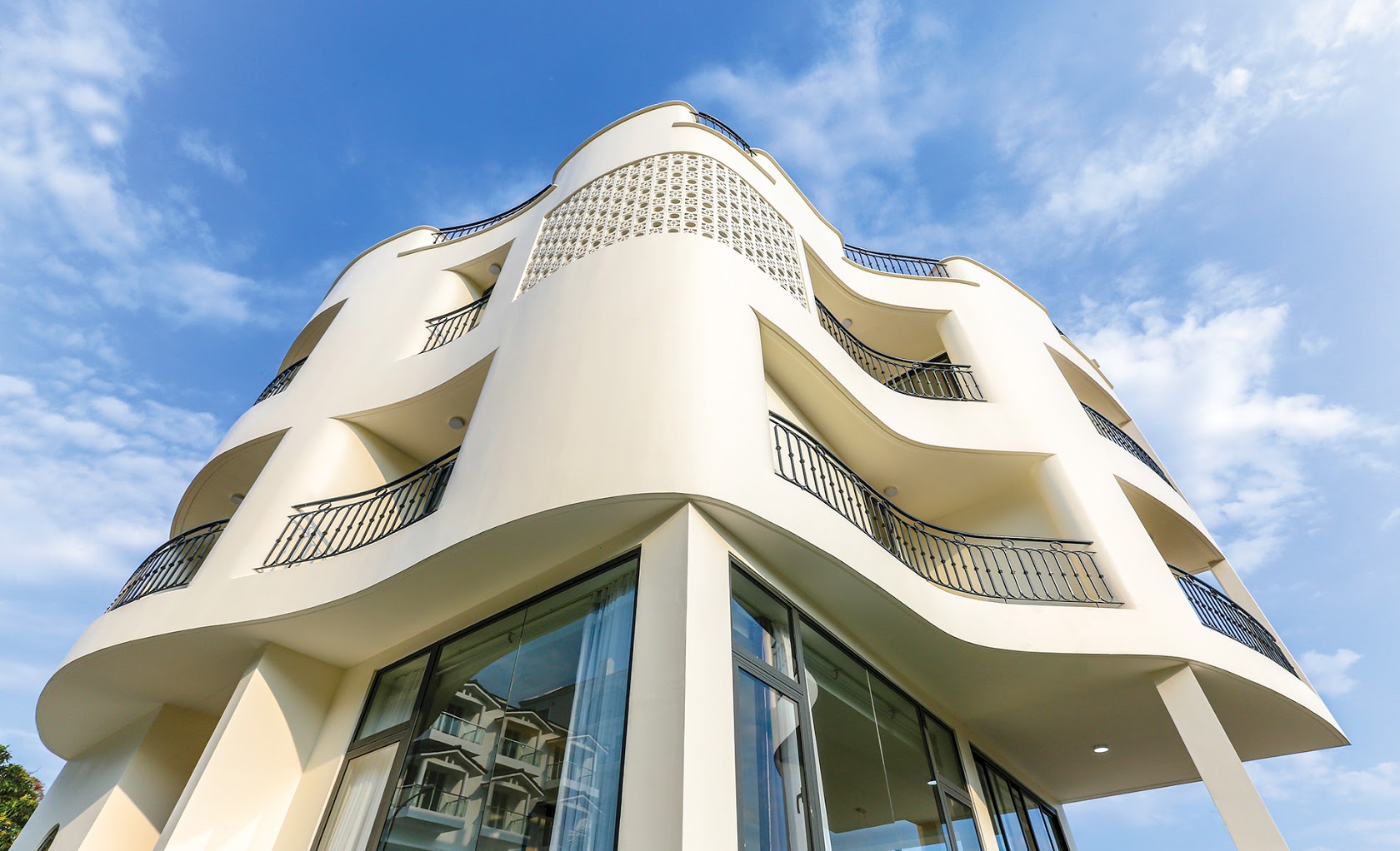 Dựa vào vị trí cao trên địa hình đồi núi, đơn vị thiết kế đã đưa những hình ảnh thiên nhiên của đồi núi, vịnh biển kết hợp cùng đường nét uyển chuyển của mặt tiền công trình tạo nên sự hoàn hảo. Đó là kín đáo, riêng tư mà không che khuất tầm nhìn quý giá, vừa mềm mại uyển chuyển mà vẫn đảm bảo được sự vững chãi, chắc chắn.
