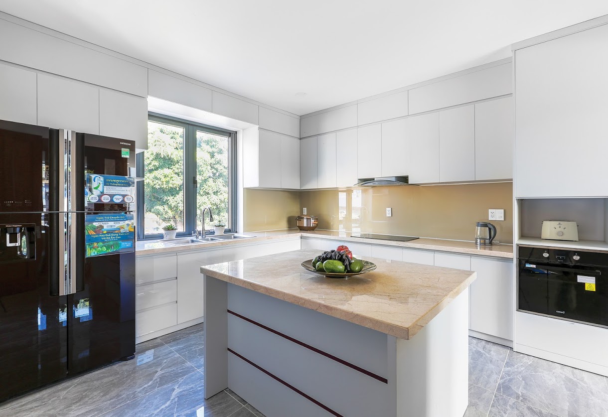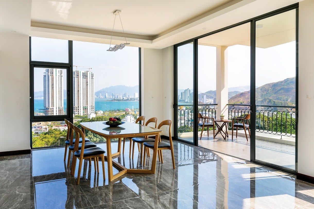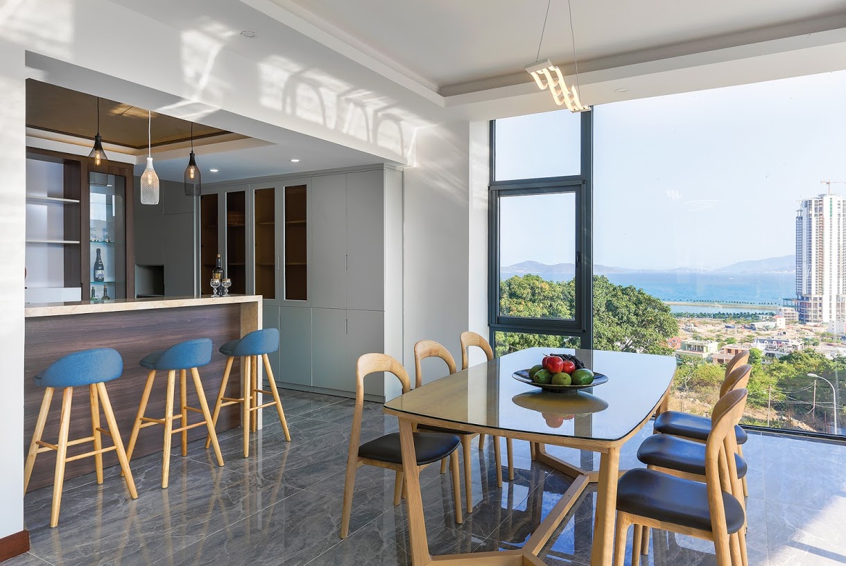 Căn biệt thự sở hữu view nhìn đẹp sang bên phải là núi Cô Tiên. Tận dụng view nhìn đẹp này kiến trúc sư đã tạo nên một bức tranh thiên nhiên sinh động, biến ảo. Khoảng sân phía trước kết hợp bàn ăn là không gian yêu thích của chủ nhà, nhất là lúc chiều về, trở thành một nơi để gia đình quây quần bên nhau sau một ngày dài, cùng nhau dùng bữa và nhìn ngắm thành phố – mặt biển lung linh khi đêm xuống.