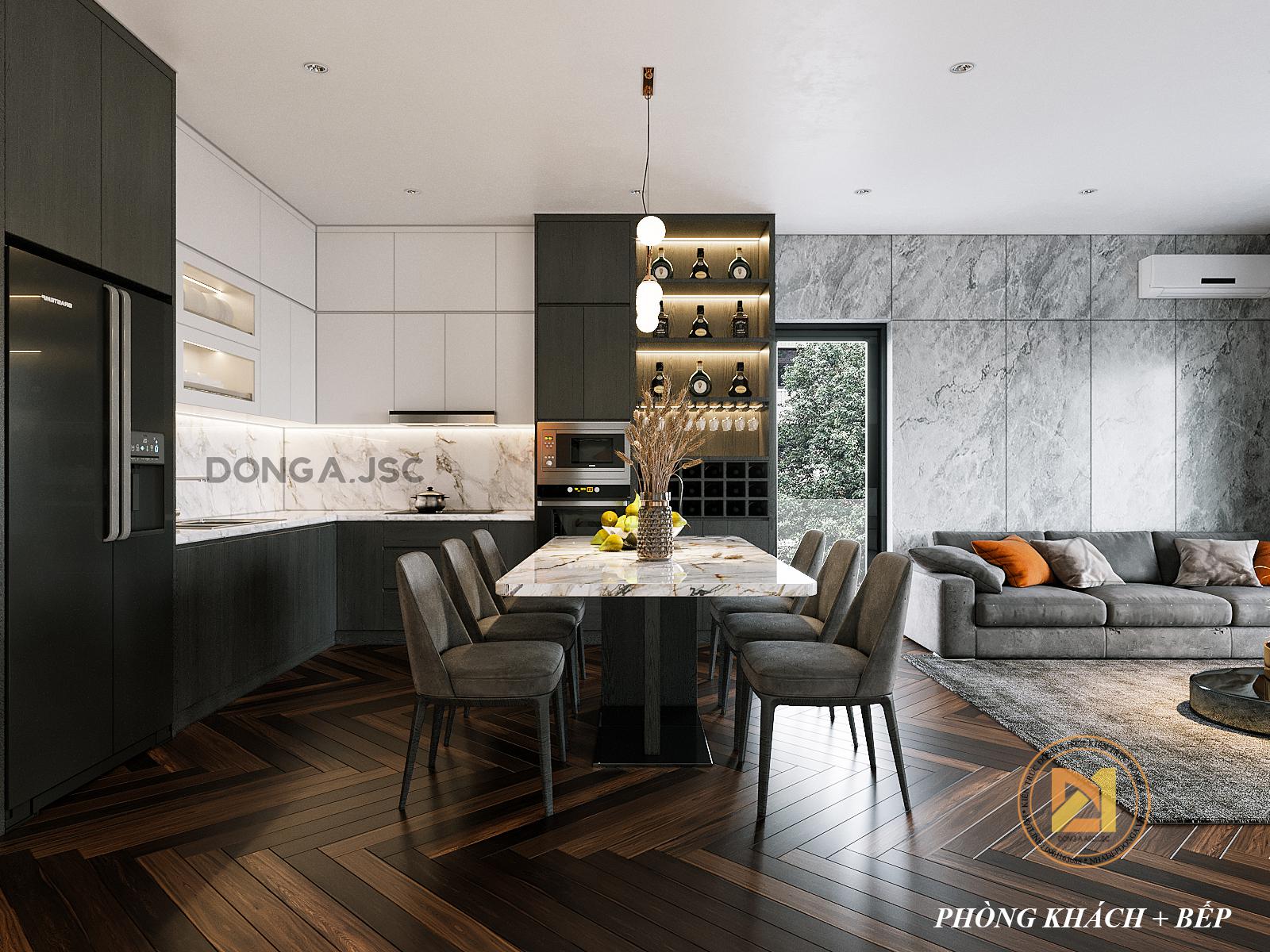 Kệ tủ bếp được tối giản các chi tiết và tập trung vào yếu tố công năng tiện nghi. Các khu vực chức năng được thiết kế và bố trí khoa học từ hệ tủ bếp, tủ rượu, tủ chứa tủ lạnh,… Khu vực bếp nấu được thiết kế cửa lớn không chỉ giúp đi lại thuận tiện hơn mà còn giúp lấy ánh sáng tự nhiên, không gian phòng bếp được lưu thông tránh bị ám mùi đồ ăn.