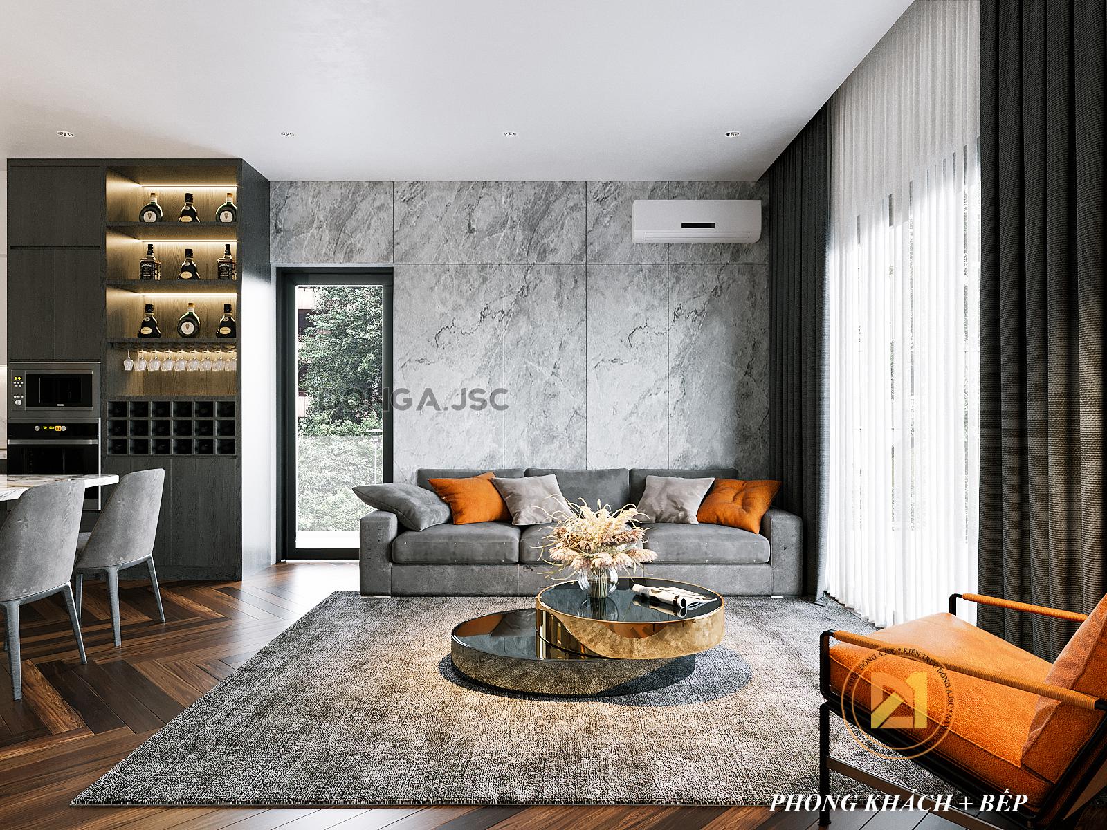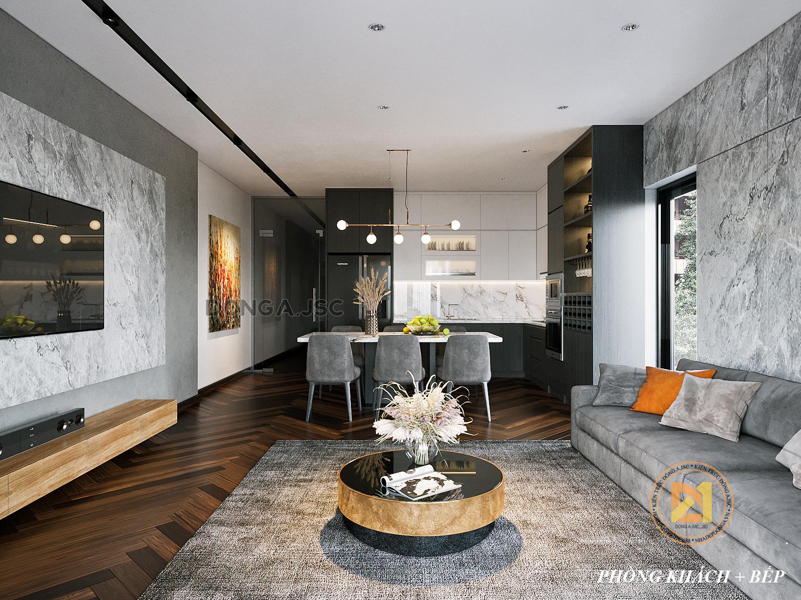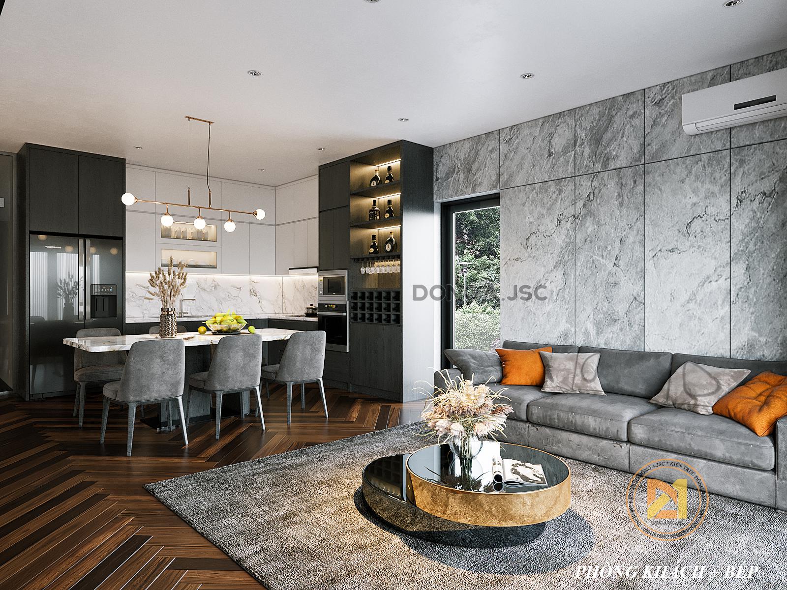 Phòng bếp và phòng khách được thiết kế nối liền nhau mà không có bất cứ vách ngăn cách nào. Với phương án thiết kế này giúp tạo không gian mở rộng hơn cho ngôi nhà, không khí các không gian trong nhà được lưu thông, thoáng mát hơn.