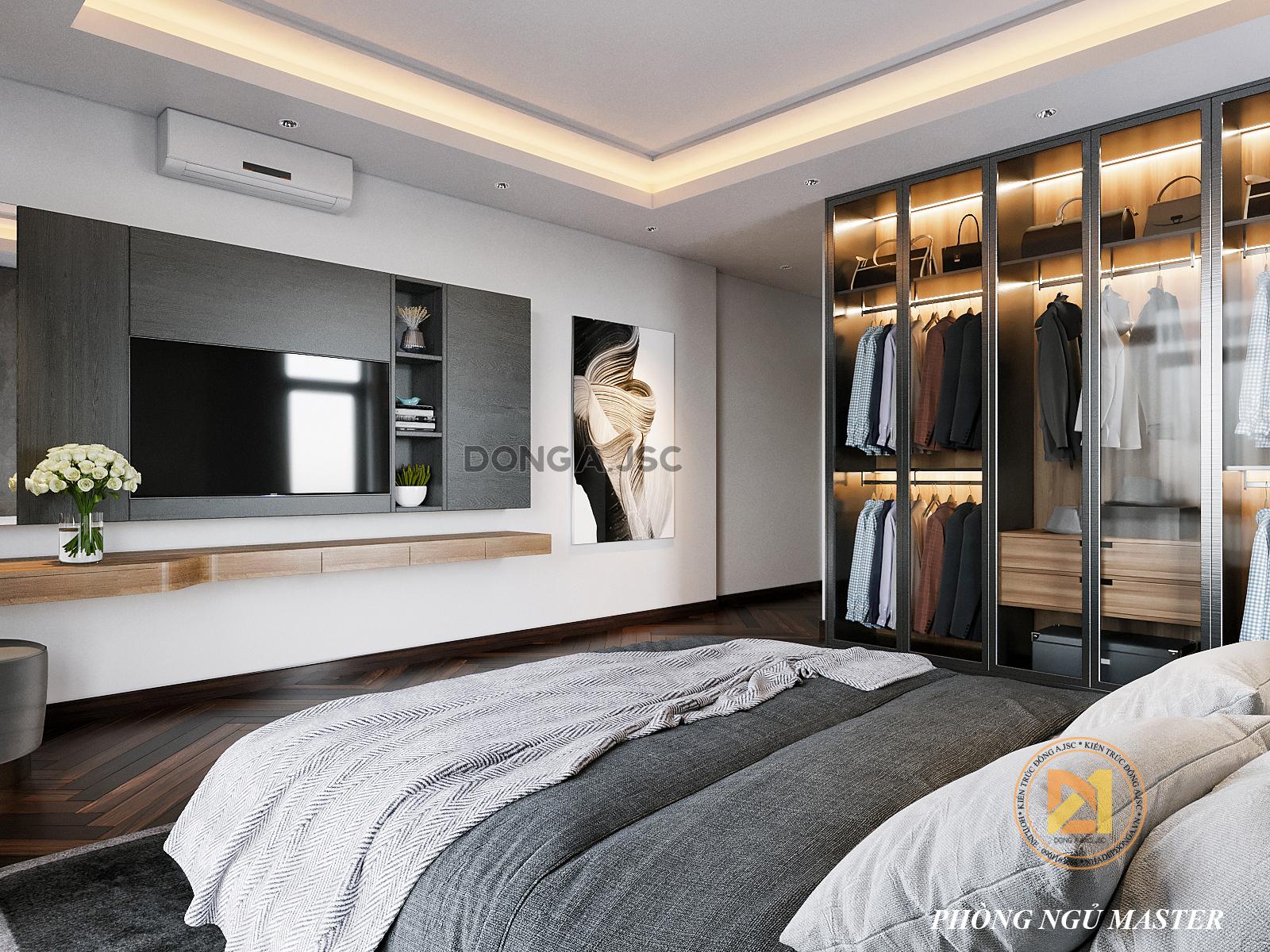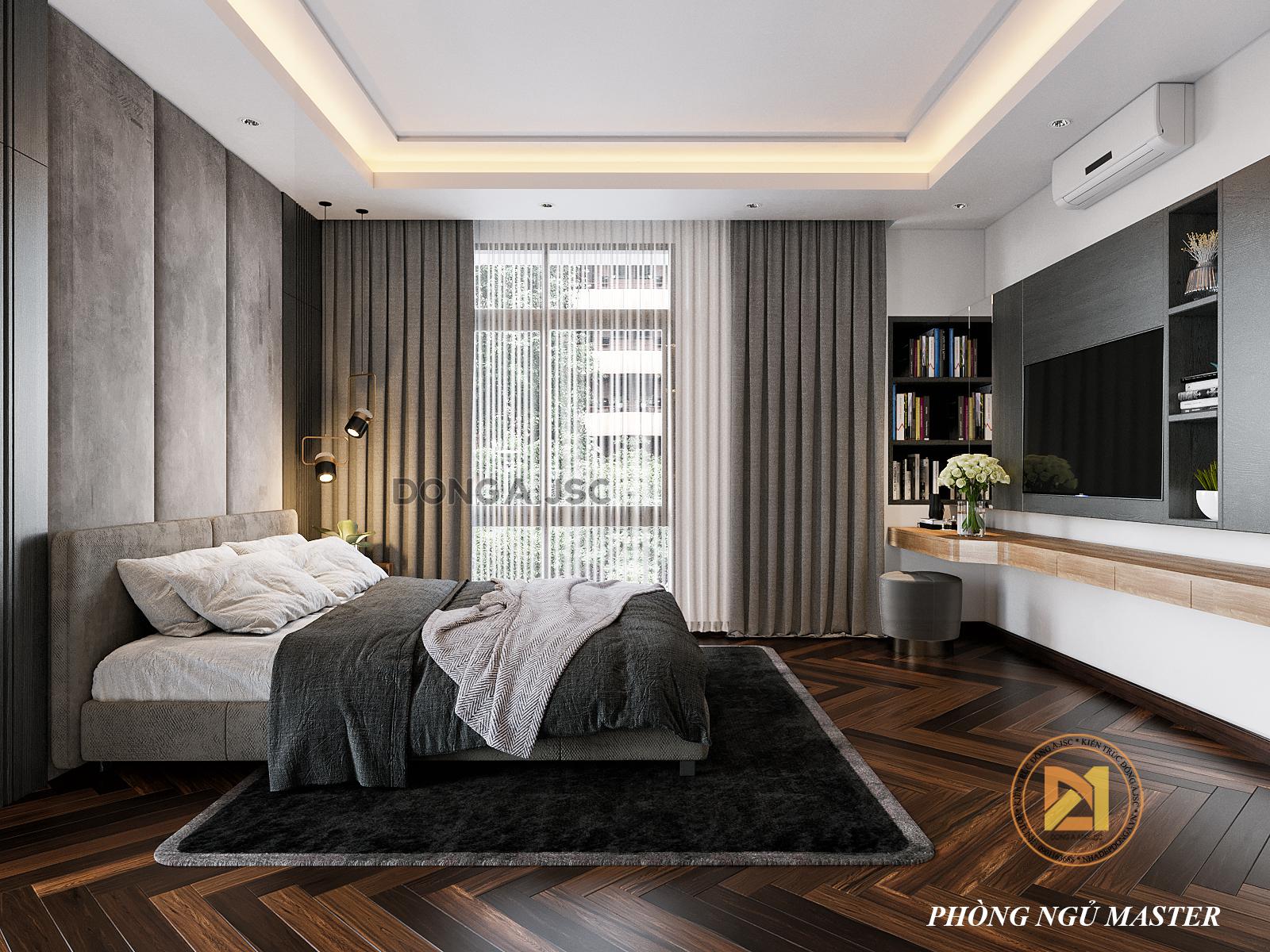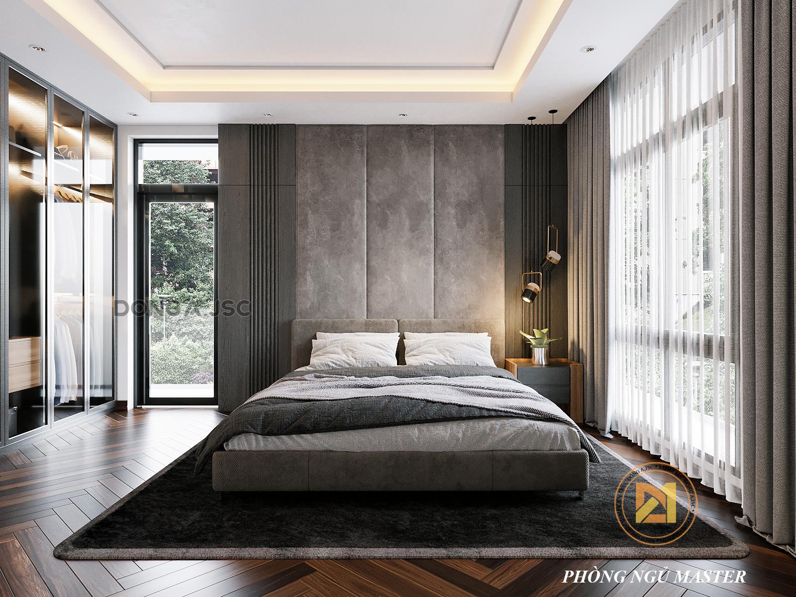 Thiết kế nội thất phòng ngủ biệt thự theo phong cách hiện đại, các chi tiết được tối giản tập trung và công năng sử dụng và tối ưu diện tích đáp ứng nhu cầu riêng và cá tính riêng của từng thành viên gia đình.