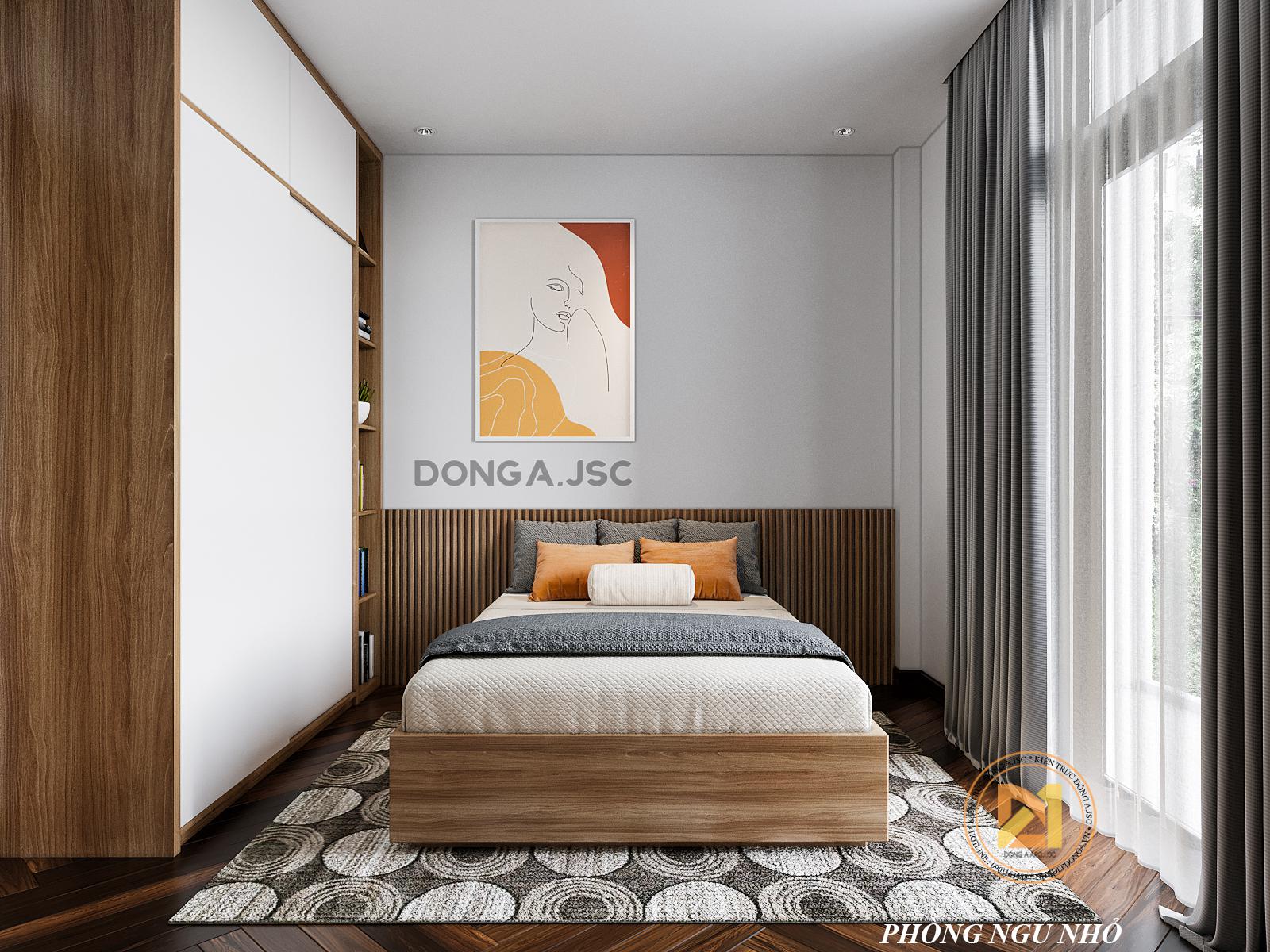 Điểm nhấn ở vách đầu giường giúp không gian phòng ngủ đẹp và sang trọng hơn. KTS Đông A sử dụng ốp vách đầu giường bọc đệm nỉ, hai bên sử dụng tấm ốp nhựa nano, lam sóng tone màu xám ghi đem đến cái nhìn mới lạ, ấn tượng để các thành viên gia đình có không gian nghỉ ngơi riêng tư và thoải mái nhất.