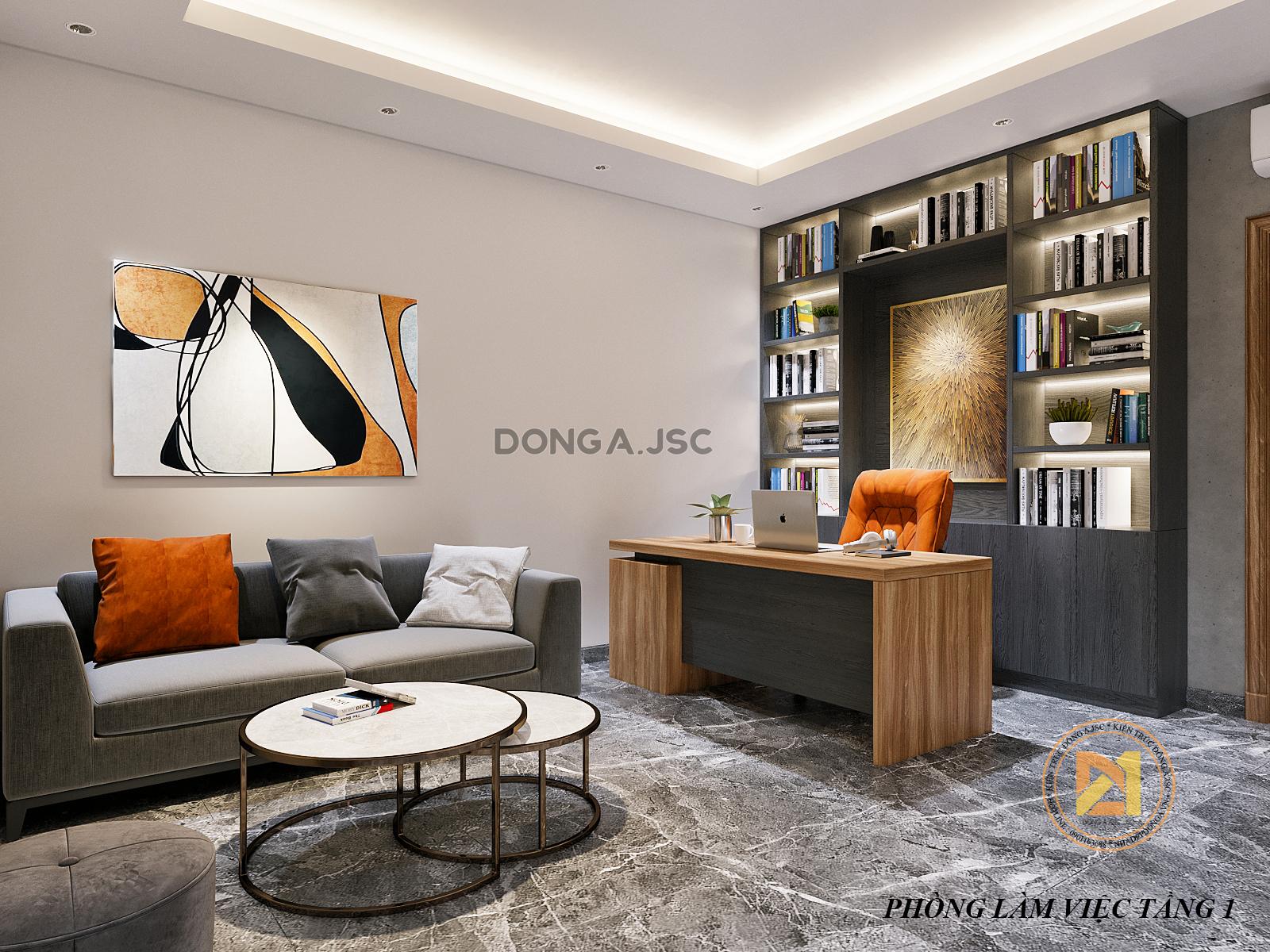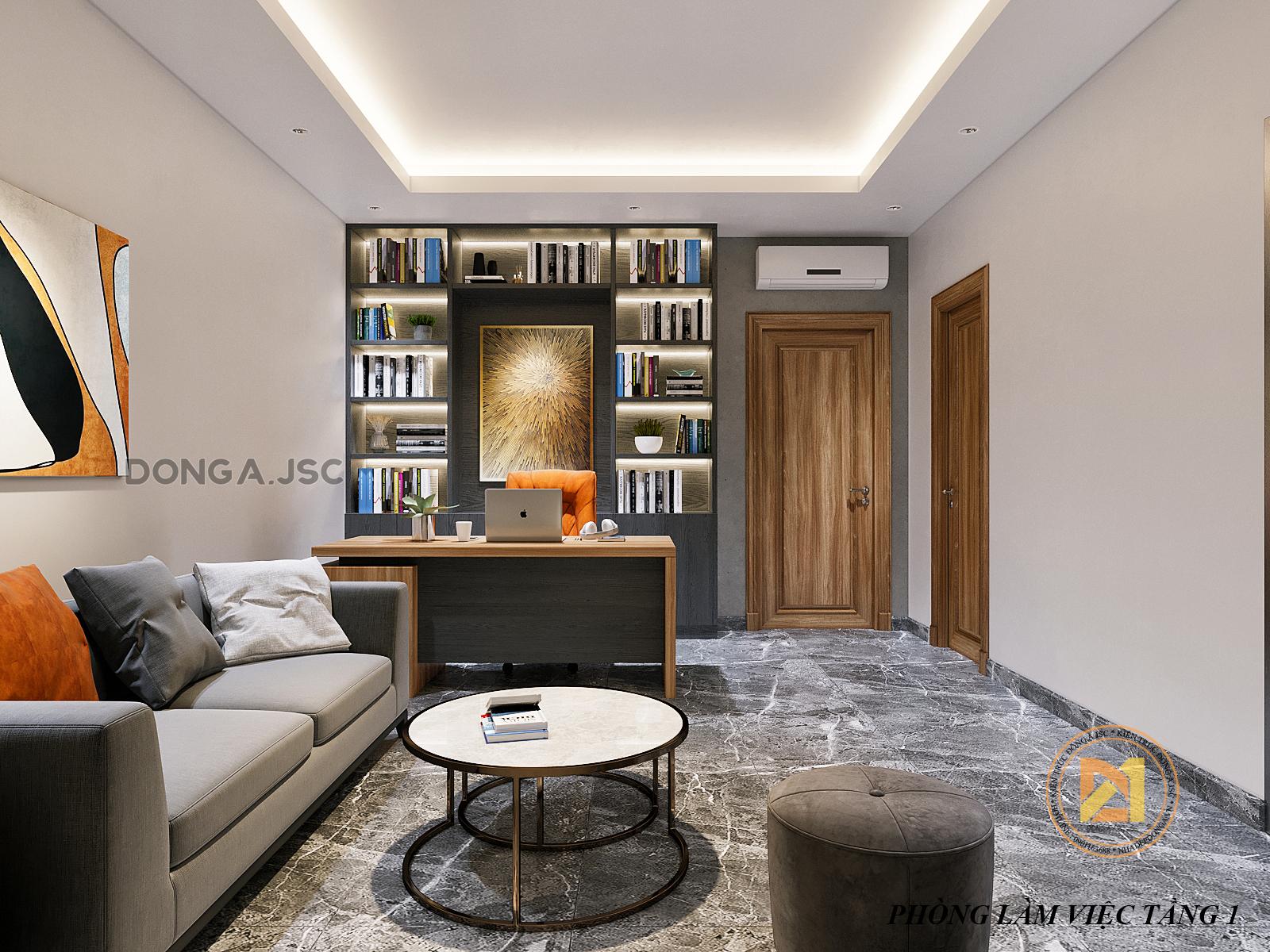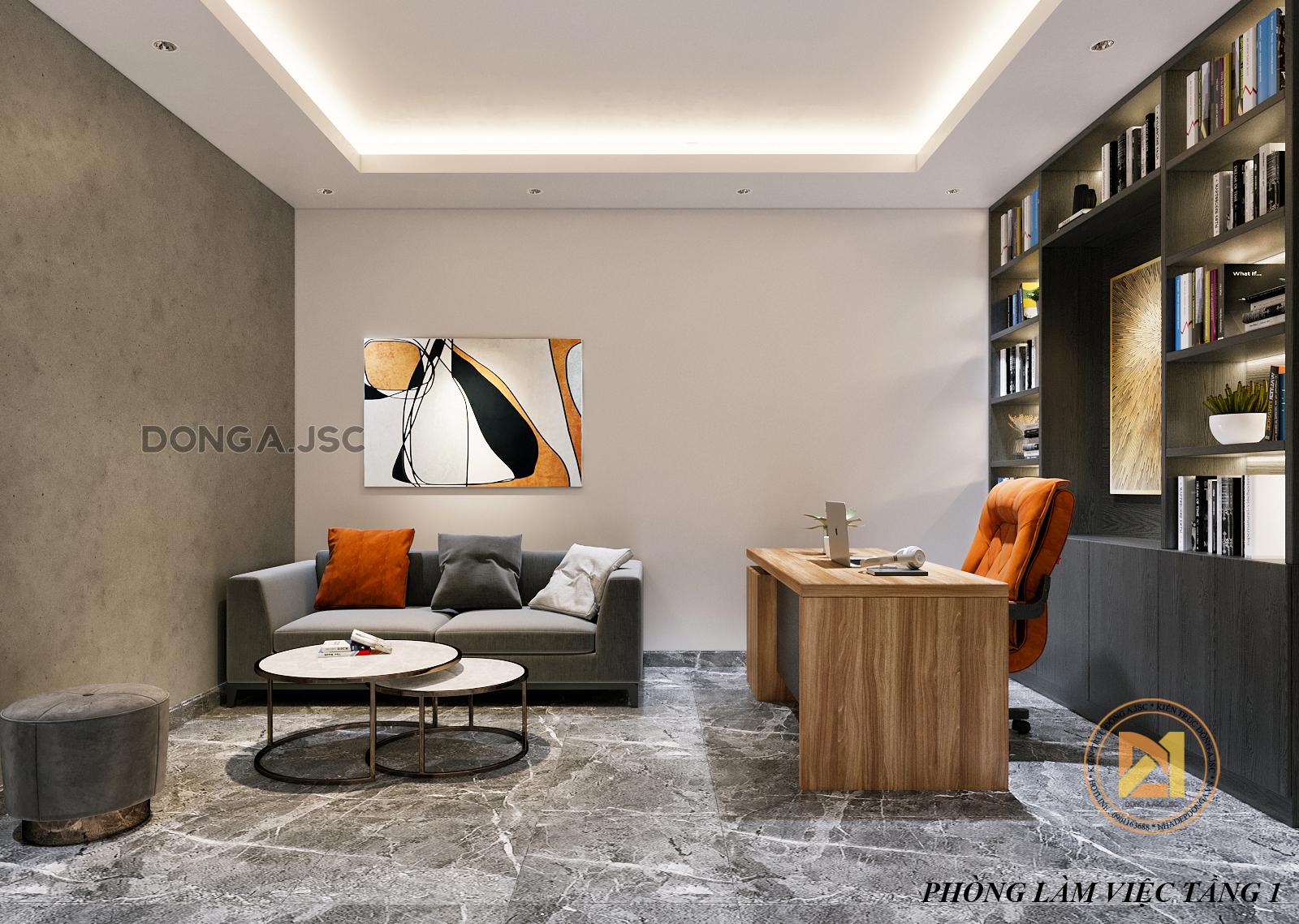 Phòng làm việc được thiết kế hiện đại, không quá cầu kỳ. Trong phòng được bài trí nội thất khoa học: một bộ sofa, bàn làm việc, tủ kệ đựng sách và tài liệu,.. Một bức tường được ốp giả bê tông là điểm nhấn cho không gian đẹp và ấn tượng hơn.